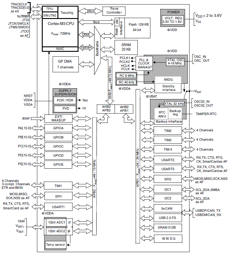 STM32F103xx中密度性能线系列集成了高性能ARM® Cortex®-M3 32位RISC内核,工作频率为72 MHz,具有高速嵌入式存储器(闪存高达128 KB,SRAM高达20 KB),以及大量连接到两条APB总线的增强型I/O和外设。所有器件都提供两个12位ADC,三个通用的16位定时器和一个PWM定时器,以及标准和先进的通信接口:多达两个I2C和SPI,三个USART,一个USB和一个CAN。