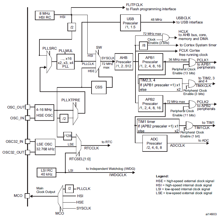 1. 当HSI被用作PLL时钟输入时,可实现的最大系统时钟频率为64MHz。