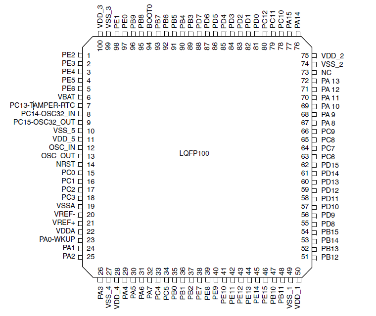 STM32F103xx中密度性能线系列包括六种不同封装类型的器件:从36引脚到100引脚。根据所选择的器件,包括不同的外设集,下面的描述概述了该系列提出的完整外设范围。